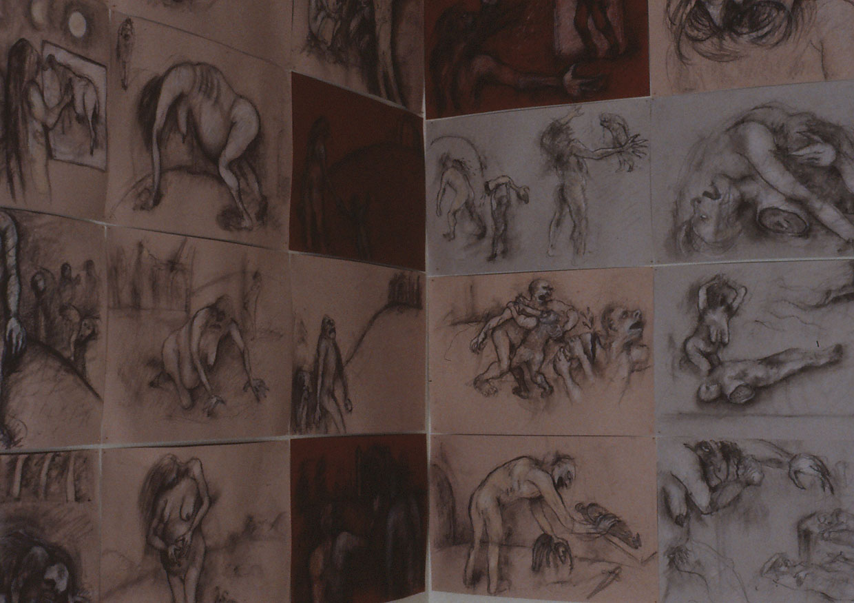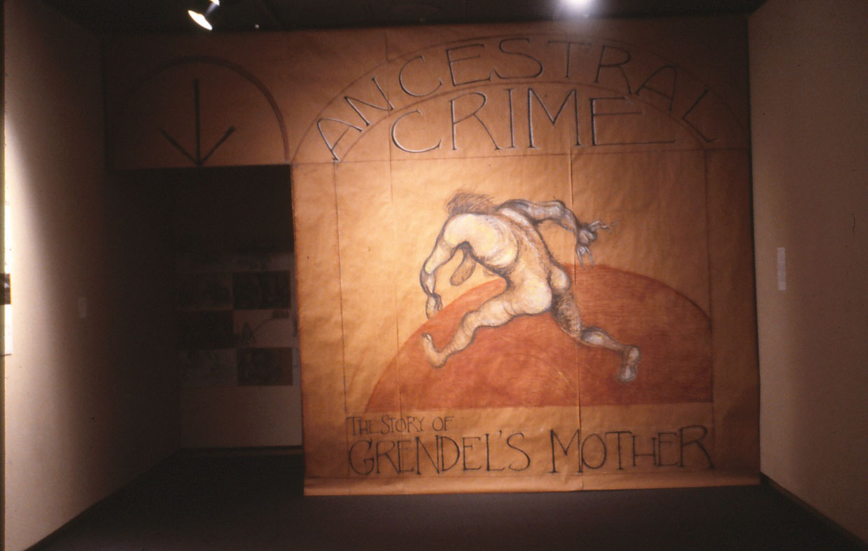 Having rediscovered Beowulf, I became drawn to Grendel’s mother, and began this series of drawings to illustrate her life. The Grendel family is referred to in the poem as the “accursed race,” because they are descendents of Cain. They are humanoid monsters and have a problematic relationship with the full-fledged humans. My narrative starts with Grendel’s mother as a girl, enjoying her life in nature, with the beasts. Her monstrousness blossoms as she reaches puberty; then she unites with Grendel’s father and becomes pregnant with Grendel. After scenes of his childhood, the drawings illustrate the Beowulf story, but from the point of view of the monsters.